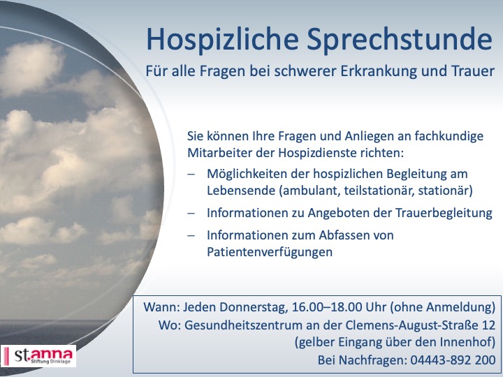 Die Hospizsprechstunde findet jeden Donnerstag von 16 bis 18 Uhr im Gesundheitszentrum an der Clemens-August-Straße 12 (gelber Eingang über den Innenhof) statt. Eine vorherige Anmeldung ist nicht notwendig. Bei Nachfragen melden Sie sich gerne unter: 04443-892 200.